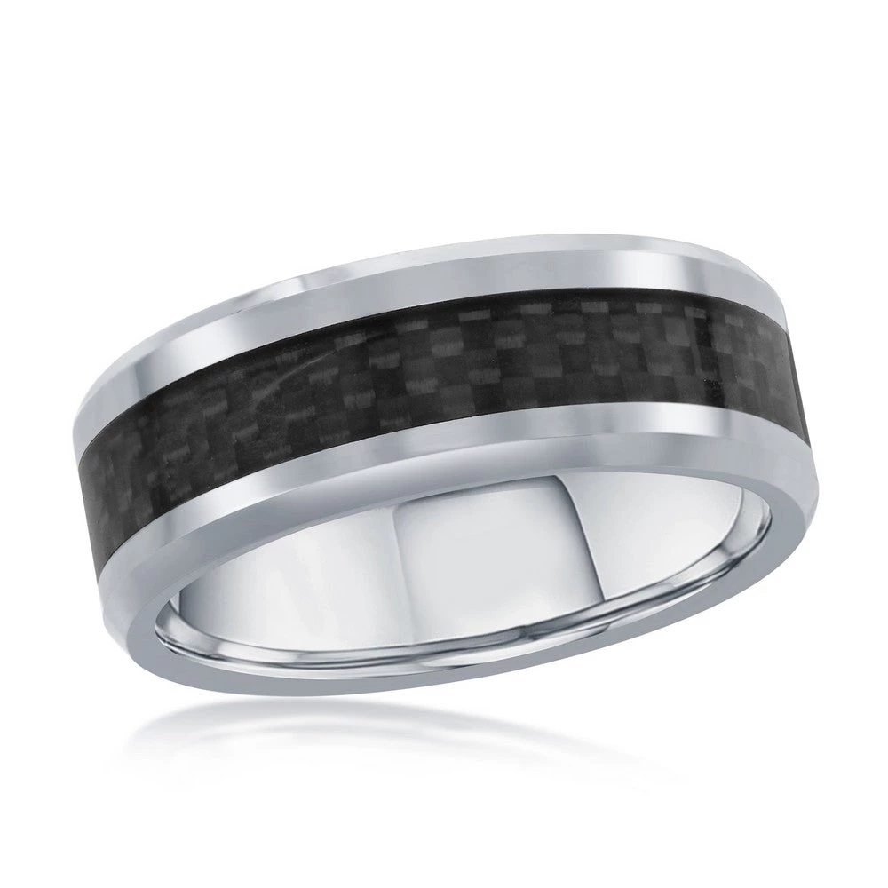 Silver Tungsten Ring W/ Black Carbon Fiber