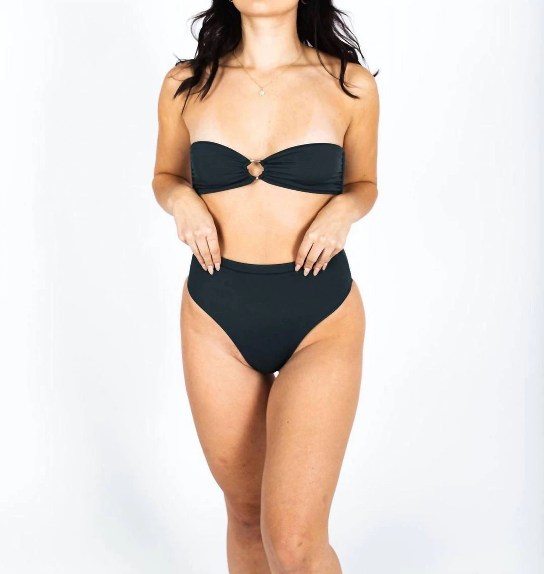 This self-tie back with a center O ring cut out is a must for this season of swim.80% Nylon + 20%Â SpandexBandeau style topCenter O ring cut outThis style runs true to size