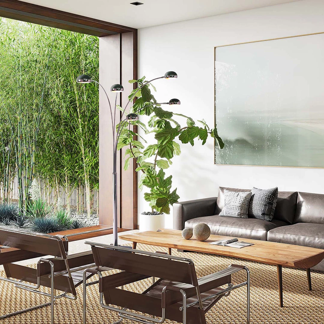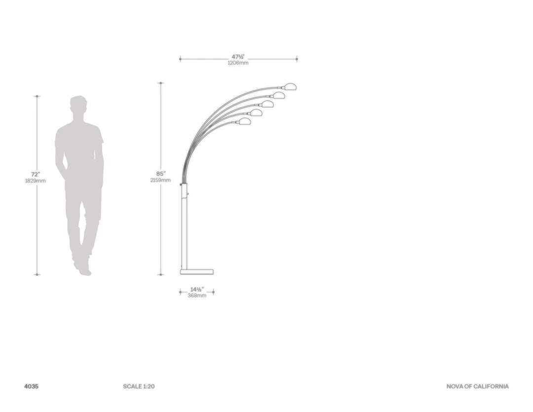 The Mushroom 5 Light Arc Lamp is a classic Nova statement piece inspired by nature with a modern twist. The modern black nickel finish enhances the aesthetic of the steel arms as they arc over a sectional or sofa. The uniquely shaped mushroom heads can be fanned out to deliver light exactly where needed. Whether for mood lighting or a good book, The Mushroom 5 Light Arc Lamp provides the perfect amount of light for any situation with dimmer switch functionality. The black marble base ensures the lamp stays exactly where placed.